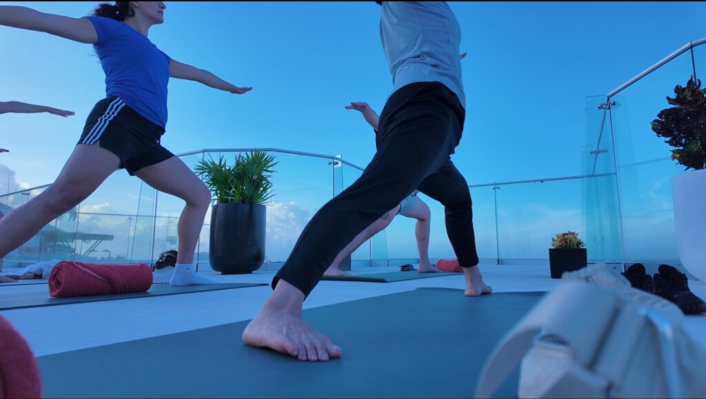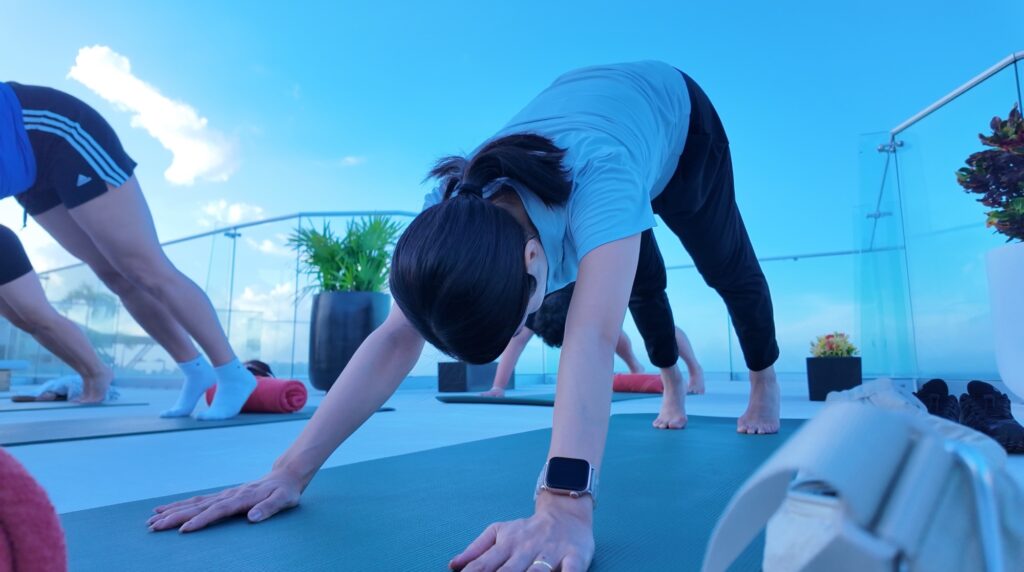 運動後はヨガのクラスへ。朝のインフィニティプールのそばで行われ、景色がとても綺麗。ニューヨーク、トロント、シンガポールなど、国際色豊かな参加者がいて楽しい時間でした。