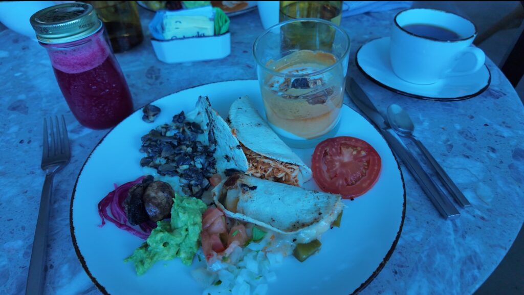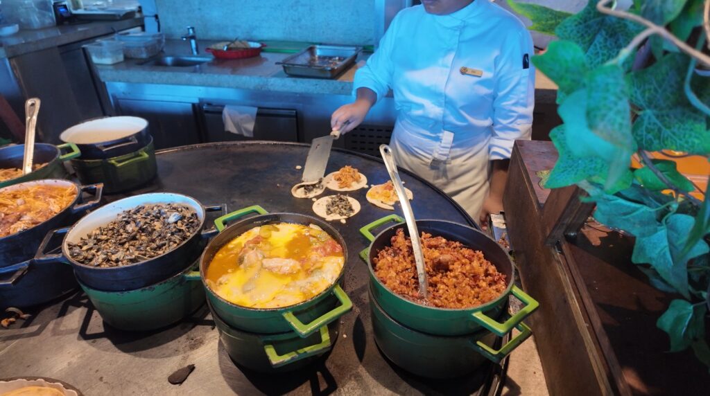 今日は2階のビュッフェへ。タコスを作ってくれるライブキッチンがあり、カスタマイズ性が高い!言葉がうまく通じず、気付いたら3つ作ってもらうことになっていました(笑)。