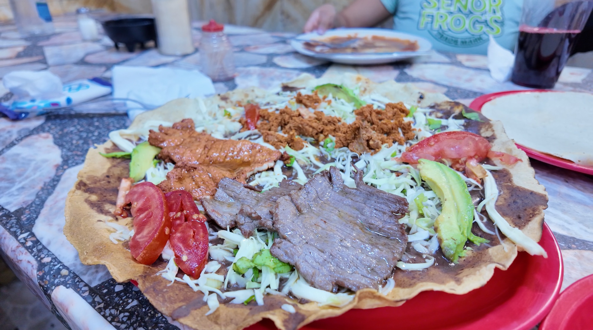 ローカル感あふれる「11月20日市場」では雑貨だけでなく、ご飯屋さんもずらりと並んでいます。その場で作られるオアハカ名物のトラユーダをいただきました。とてもボリューミーで、半分でも満腹に。