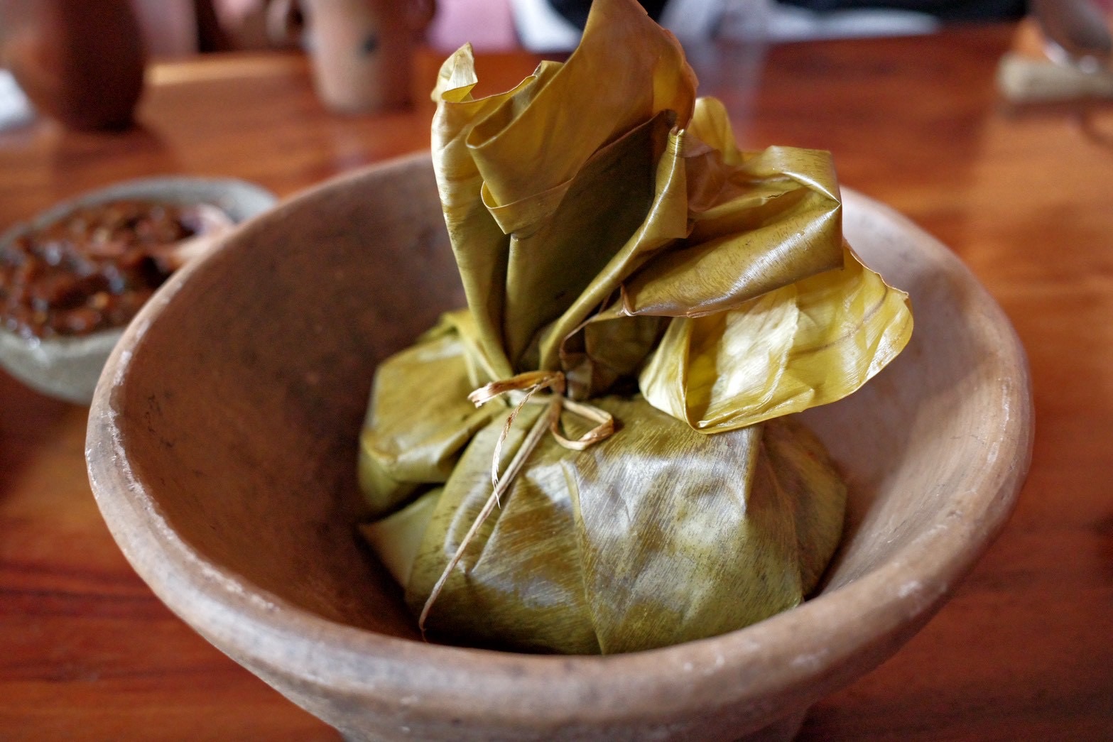 これはかぼちゃとエビのタマレ。ちまきのように葉に包まれていて、中にはすりつぶした甘いかぼちゃにスパイスが。エビのだしも感じる、少しスパイシーだけど優しいお味。