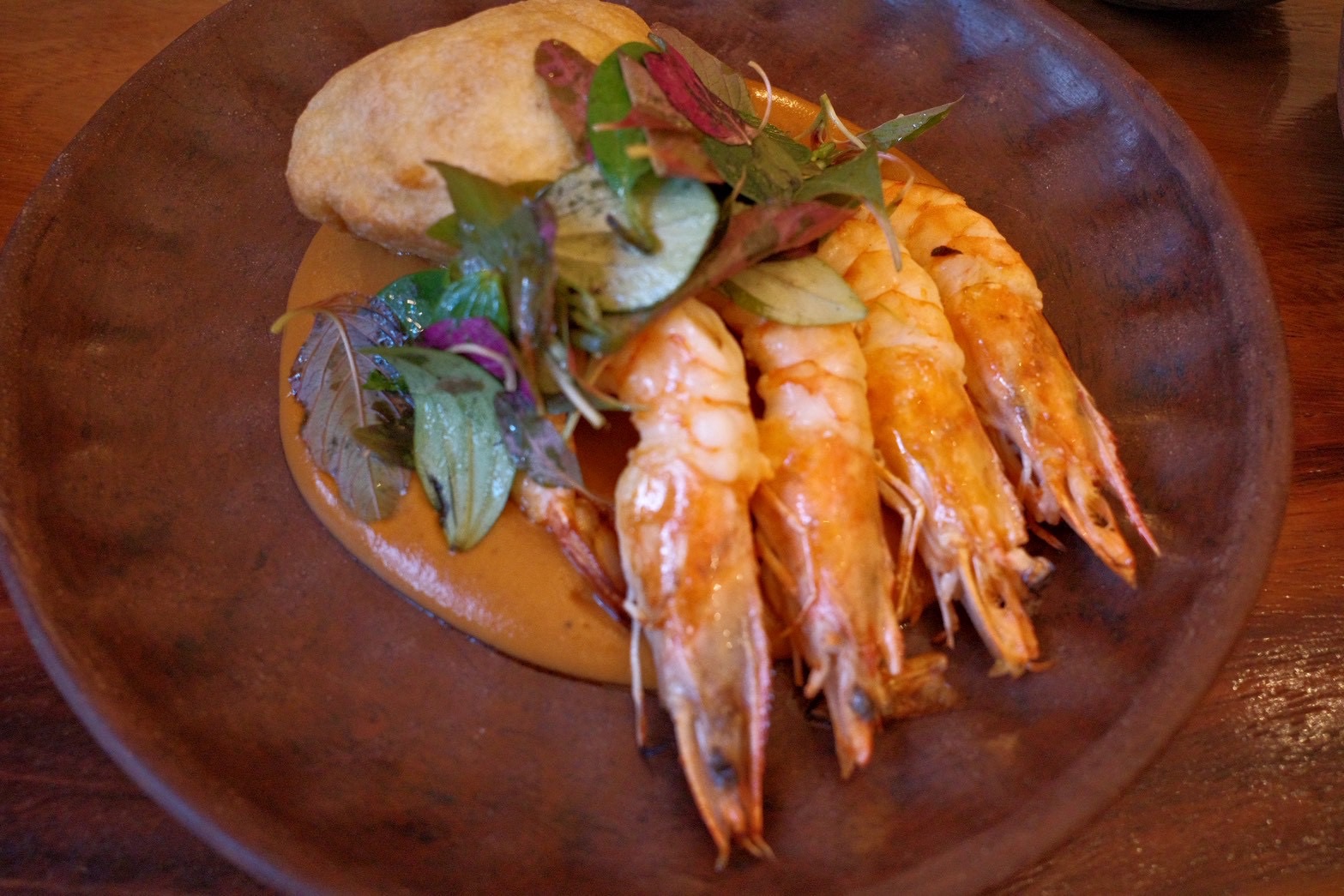 カリフラワーとエビのモレ。カリフラワーがしょっぱいドーナツのようなものと一体となって揚げられてる。その横にはプリップリのエビが!エビは下処理が完璧で、端から端まで余すことなく食べられるようになっていました。