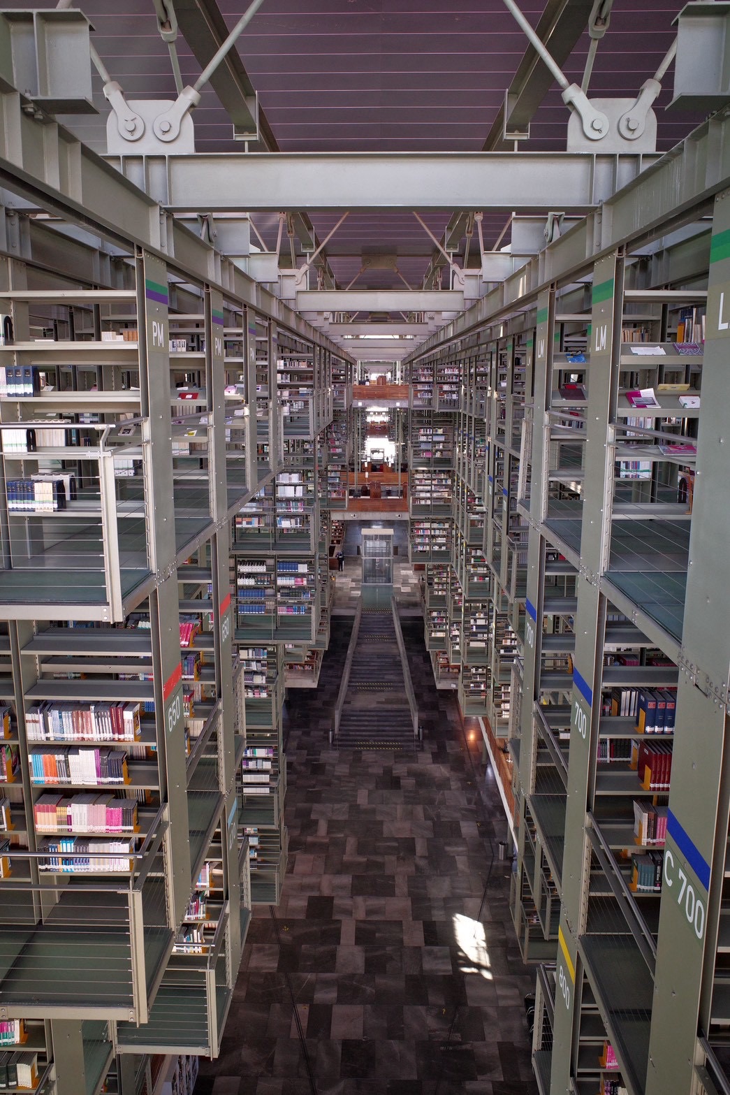 ここは天井から吊るされた鉄の棚に蔵書がずらりと並び、その姿は圧巻です。